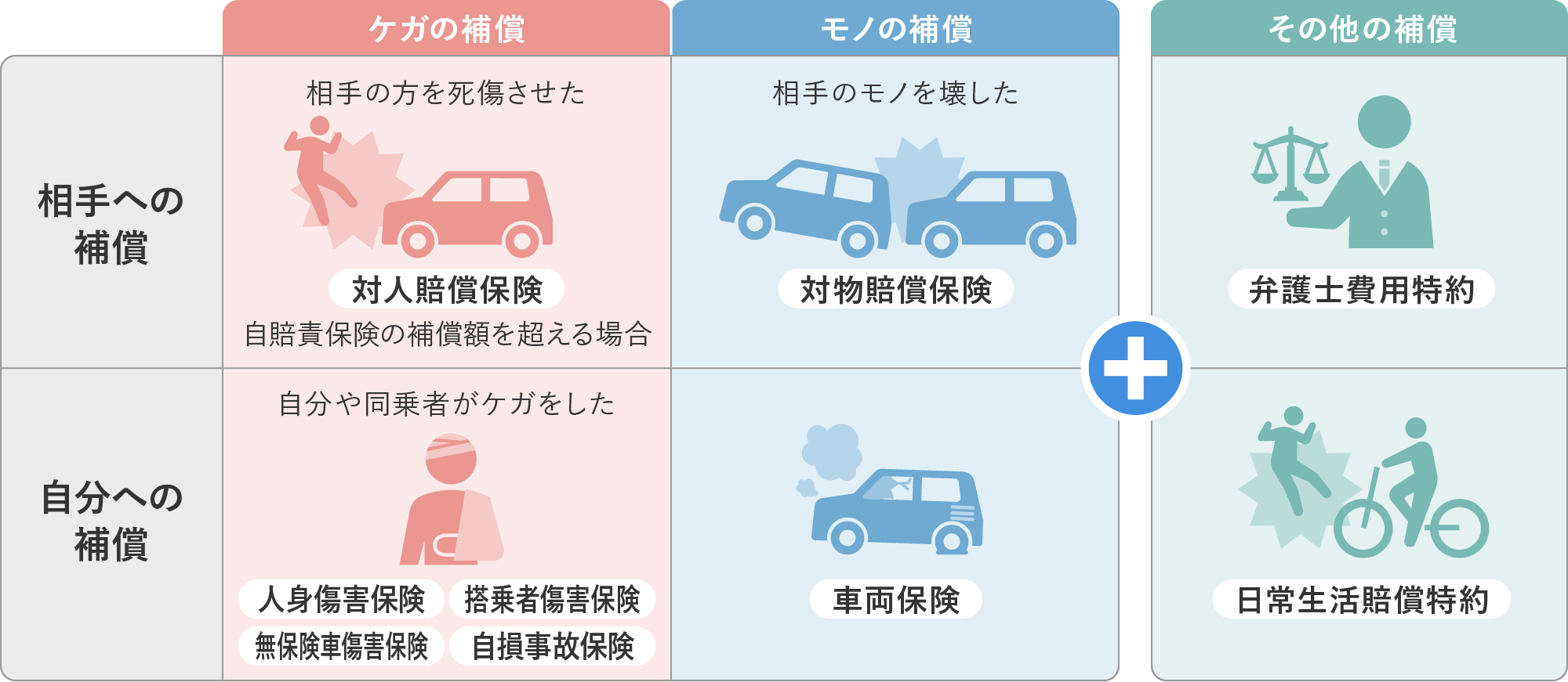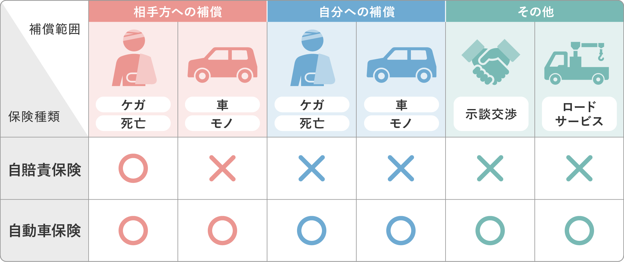 自賠責保険は法律により加入が義務付けられており、補償範囲は「相手方のケガ・死亡」のみです。
