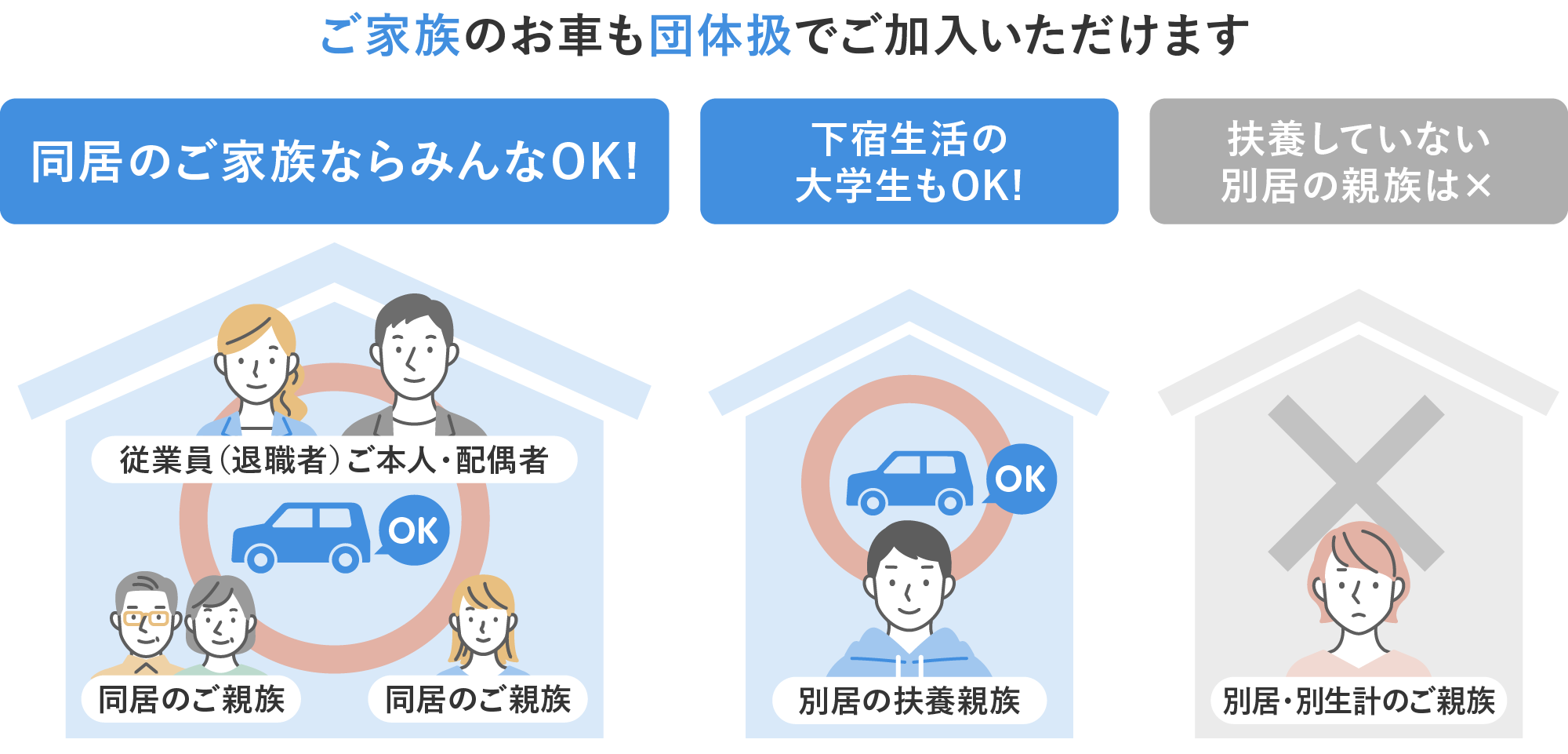 ご契約のお車を主に使用される方等(記名被保険者)および車両所有者は、保険契約者、保険契約者の配偶者、保険契約者またはその配偶者の同居の親族・別居の扶養親族の方となります。